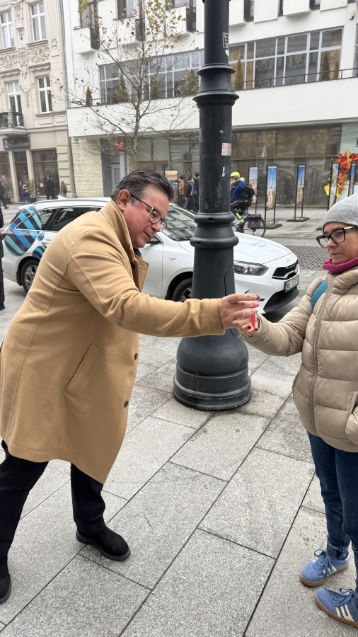 "Szanowni Państwo, jesteśmy dokładnie w przededniu rocznicy odzyskania przez Polskę niepodległości. Bardzo ważne święto, święto wszystkich obywateli, bez względu na to, czy są zwolennikami lewicy, prawicy, święto nas wszystkich. Dlatego dzisiaj z okazji tego święta będziemy rozdawać mieszkańcom Łodzi kotyliony, żeby jutro dumnie ten kotylion przyczepili sobie do kurtki, do marynarki, do swetra i dumnie pokazywali, że Polska jest niepodległym krajem". - mówił Tomasz Trela, Poseł Na Sejm RP.